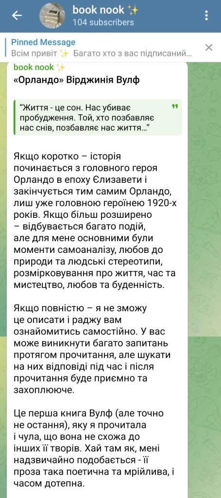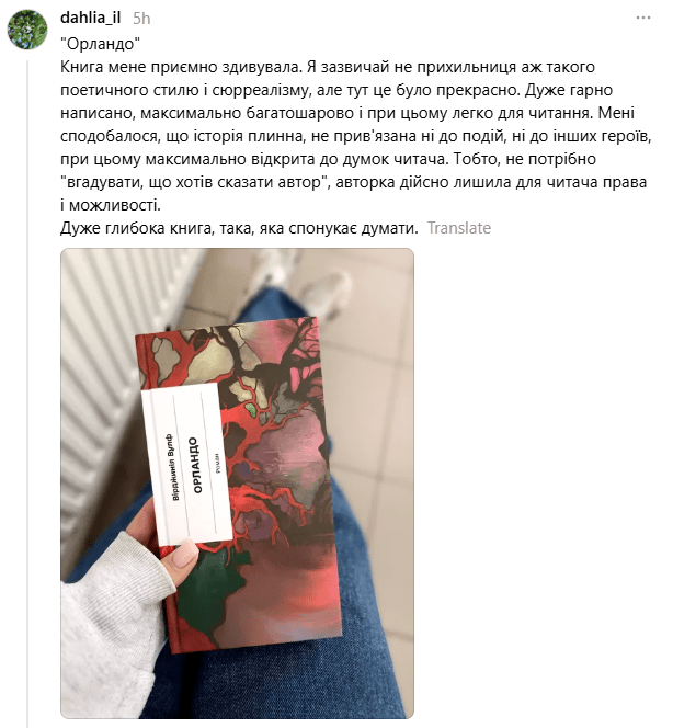 Книгу «Орландо» я читала спільно з дівчатами у Threads. Оскільки я була ініціаторкою цього спільного читання, я не могла не дочитати книгу до кінця. Якби я читала «Орландо» сама, я би не закінчила її.