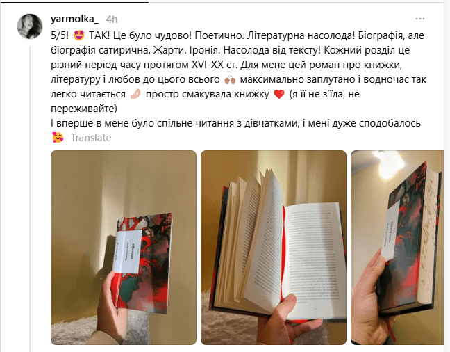 Книга хороша, але я її не оцінила. Я читала її спільно з дівчатами зі Threads, і їм дуже сподобалася книга.