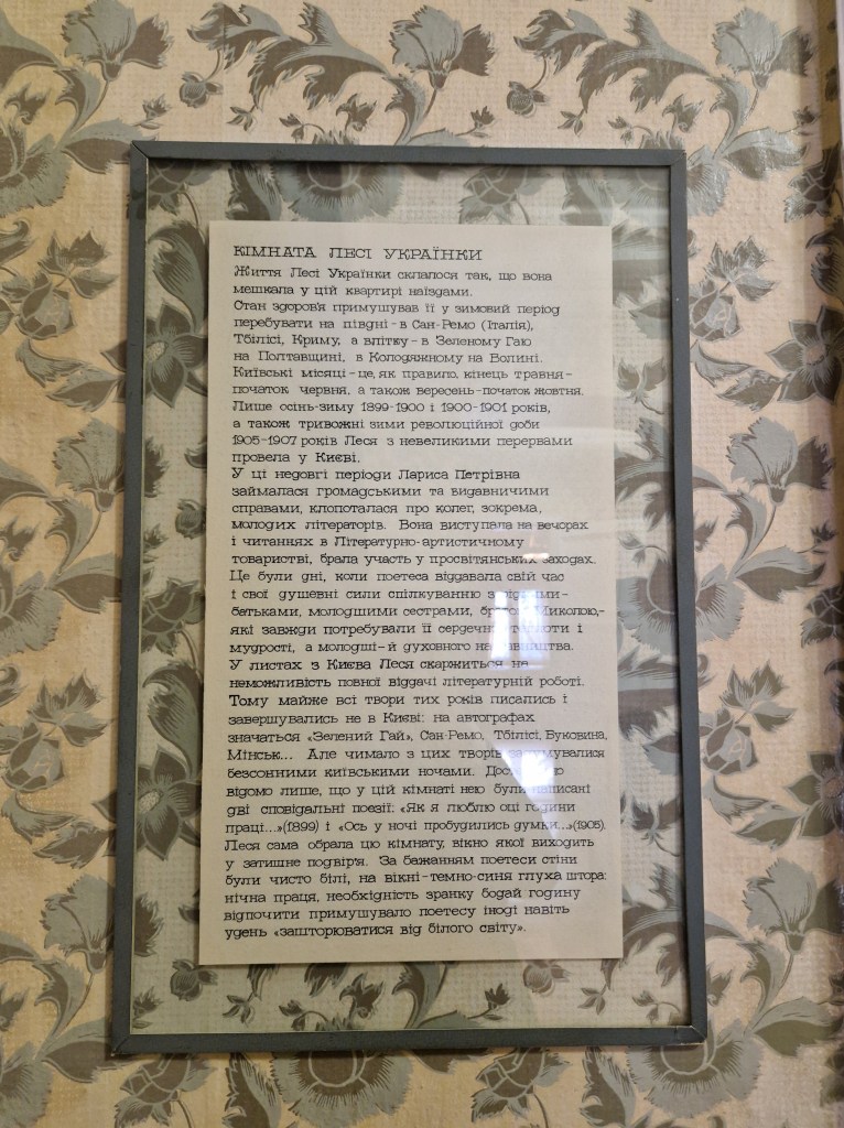 Тому майже всі твори тих років писались і завершувались не в Києві: на автографах значаться «Зелений Гай», Сан-Ремо, Тбілісі, Буковина, Мінськ… Але чимало з цих творів за тумувалися безсонними київськими ночами. Відомо лише, що у цій кімнаті нею були написані дві сповідальні поезії: «Як я люблю оці години праці…» (1899) і «Ось у ночі пробудились думки…» (1905). […]».