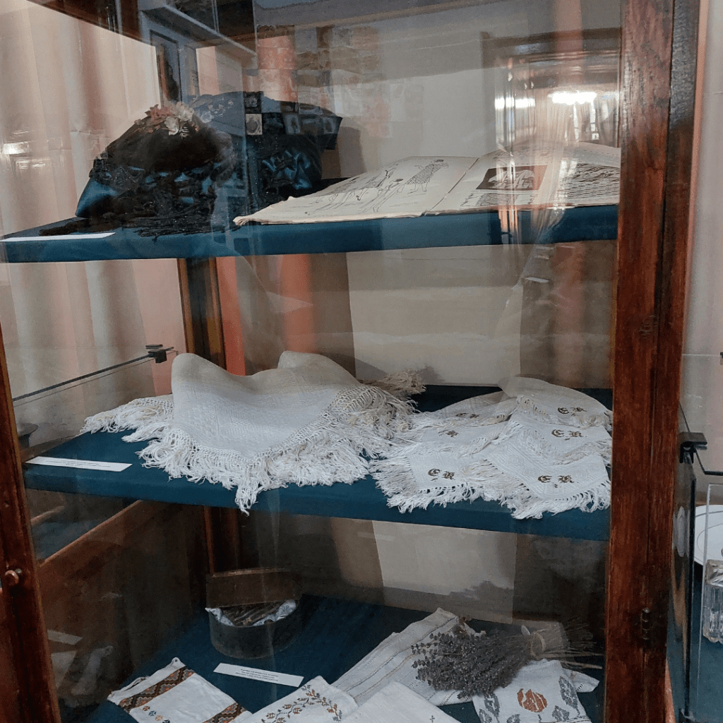 У залах музею можна побачити музичні інструменти, старовинні пісенники, кухонне начиння: форму для кексів, ступку, кавник, дерев’яну тарілку для мамалиги. На столі лежить скатертина та серветки, вишиті Євгенією Кобилянською.