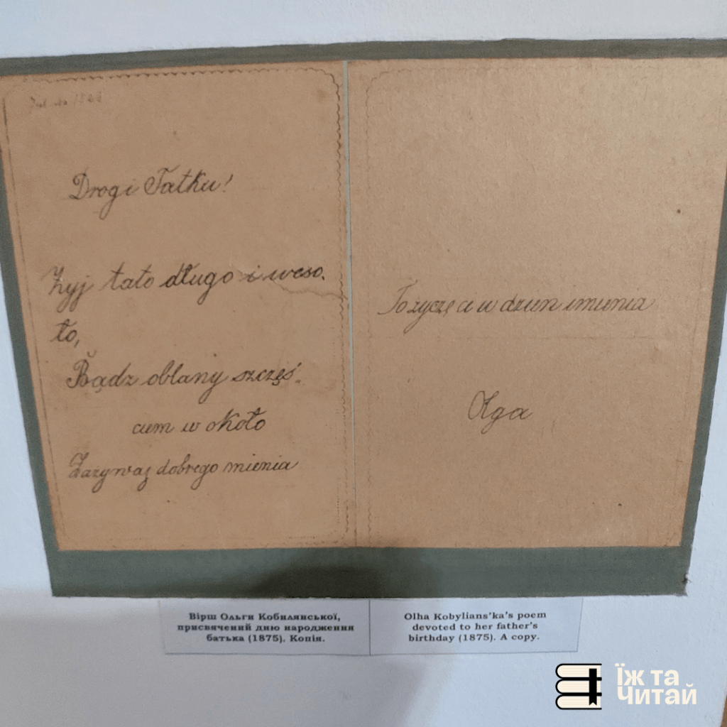 Музей — це не лише кімнати з автентичними меблями, а й жива історія, яку зберігають речі, фотографії, листівки. Одна з них — фото письменниці 1902 року, яке стало популярною листівкою. Тут усе нагадує, що Кобилянська жила в колі друзів, працювала, мріяла й берегла рідний дім, який сьогодні розповідає її історію.